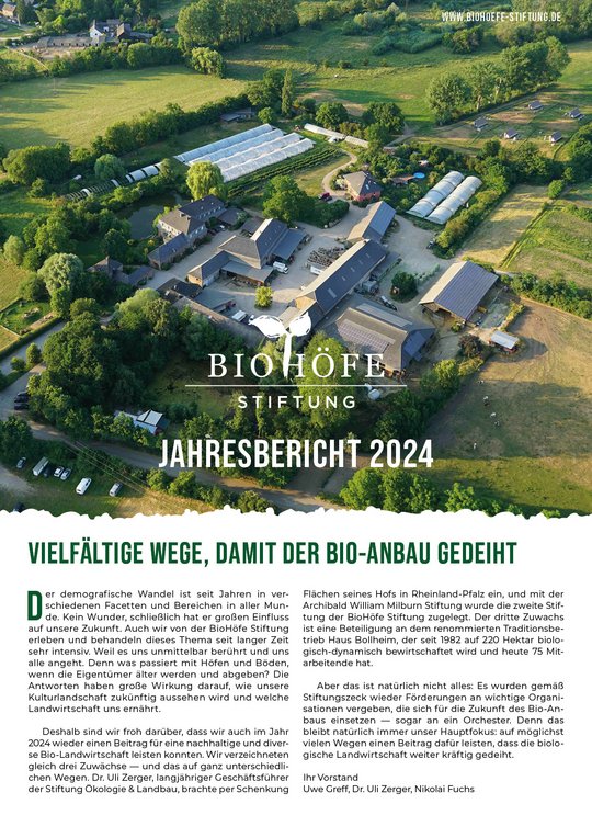 2024 war für die BioHöfe Stiftung ein Jahr des Wachstums: Durch die Schenkung von Flächen durch Dr. Uli Zerger, die Zulegung der Archibald William Milburn Stiftung und die Beteiligung am Traditionsbetrieb Haus Bollheim konnte die Stiftung ihre Basis weiter stärken – und zugleich wichtige Förderungen für den Bio-Anbau vergeben.